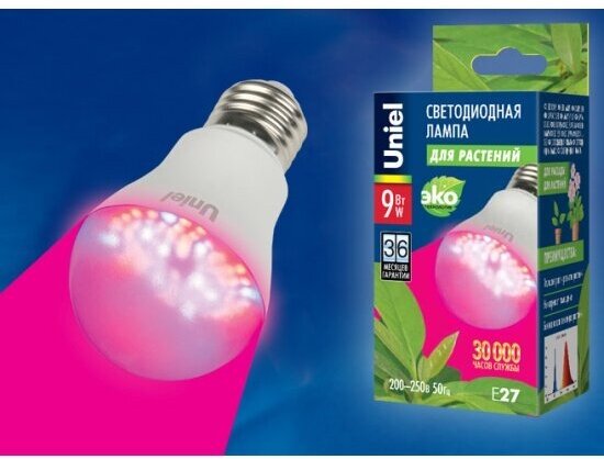 Лампа светодиодная для растений Uniel ALM01WH 09645, E27, A60, 9 Вт, 650 К