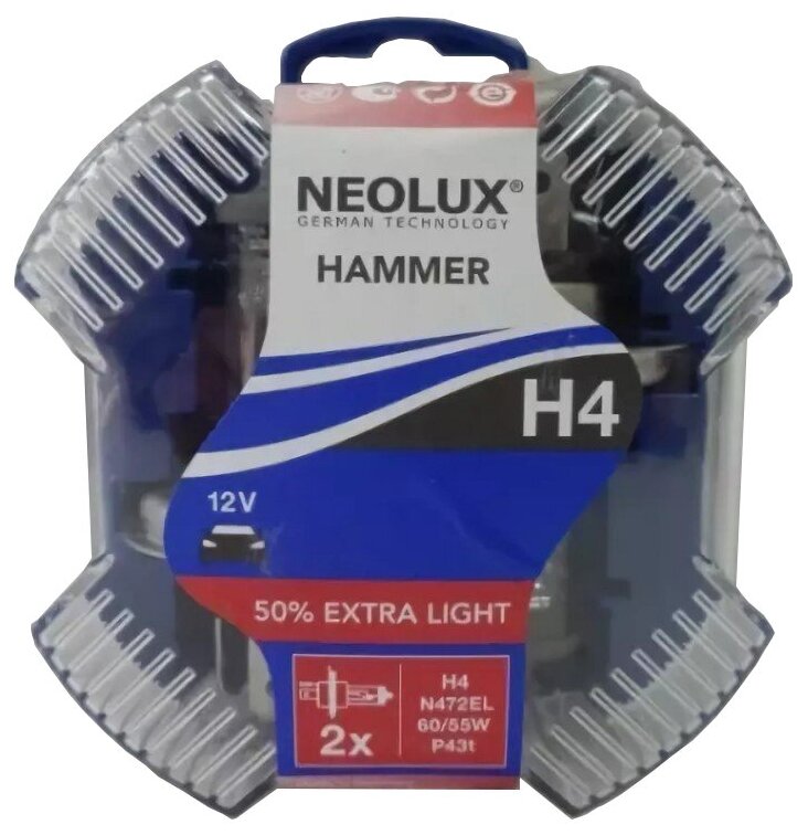 Лампа H4 12V 60/55W EXTRA LIGHT +50% P43t, карт.2 шт. информация: