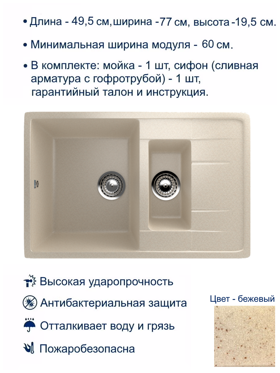 Мойка Ulgran, мрамор, U-205-328, (770*495*195 мм), бежевый, сифон и сливная арматура