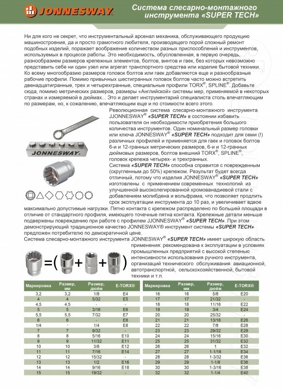 Набор торцевых головок Super Tech 3/8"DR Jonnesway S68H3126S информация: