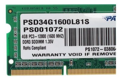 Оперативная память для ноутбука 4Gb (1x4Gb) PC3-12800 1600MHz DDR3 SO-DIMM CL11 Patriot PSD34G1600L81S информация: