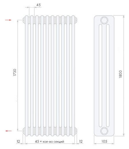 Радиатор Konner LUX 100/200 10 секций боковое подключение алюминий белый