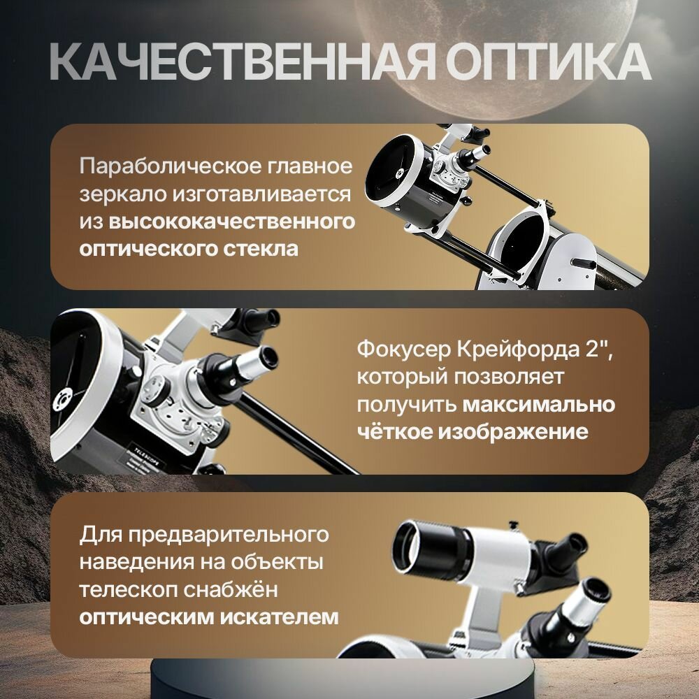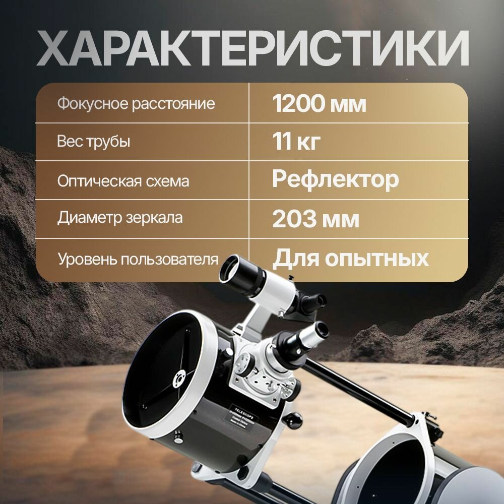 | Комплектация | труба телескопа 460x203, монтировка Добсона, адаптер 1.25", навинченный на пластину Т2, окулярный адаптер 2", окуляры Super 10 и 25 мм, 1,25", искатель оптический 8x50 с O-кольцом на кронштейне |