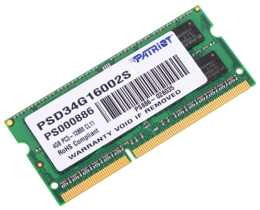 Оперативная память для ноутбука 4Gb (1x4Gb) PC3-12800 1600MHz DDR3 SO-DIMM CL11 Patriot PSD34G16002S информация: