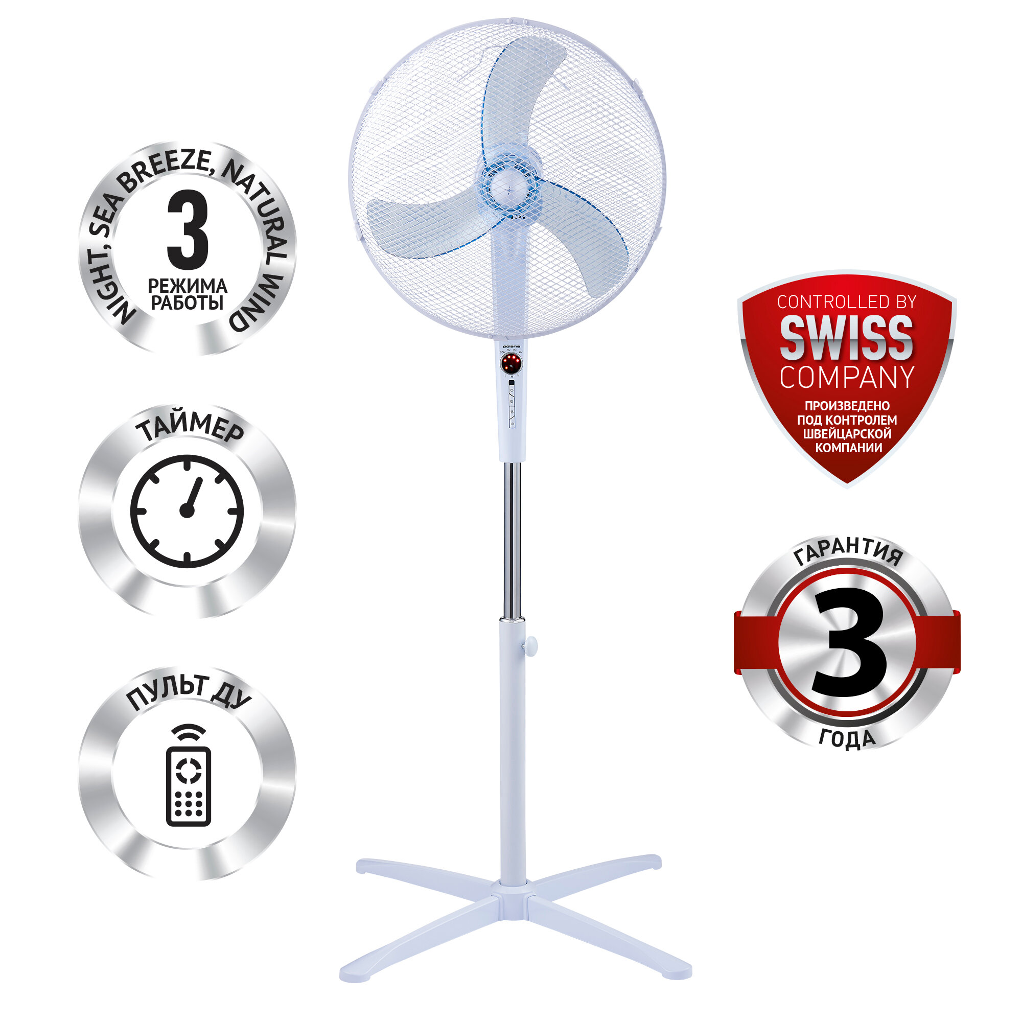 Вентилятор напольный Polaris PSF 3040RC, 55 Вт, пульт ДУ, 3 скорости, белый