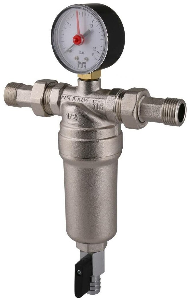 Фильтр промывной с манометром, с разъемными соединениями, латунной колбой TIEMME 1/2"