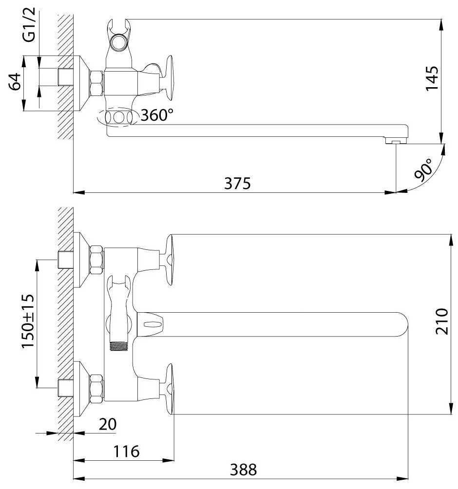 Смеситель на раковину настенный Эверест B46-350 с круглым поворотным изливом, кран-буксы 1/2", хром