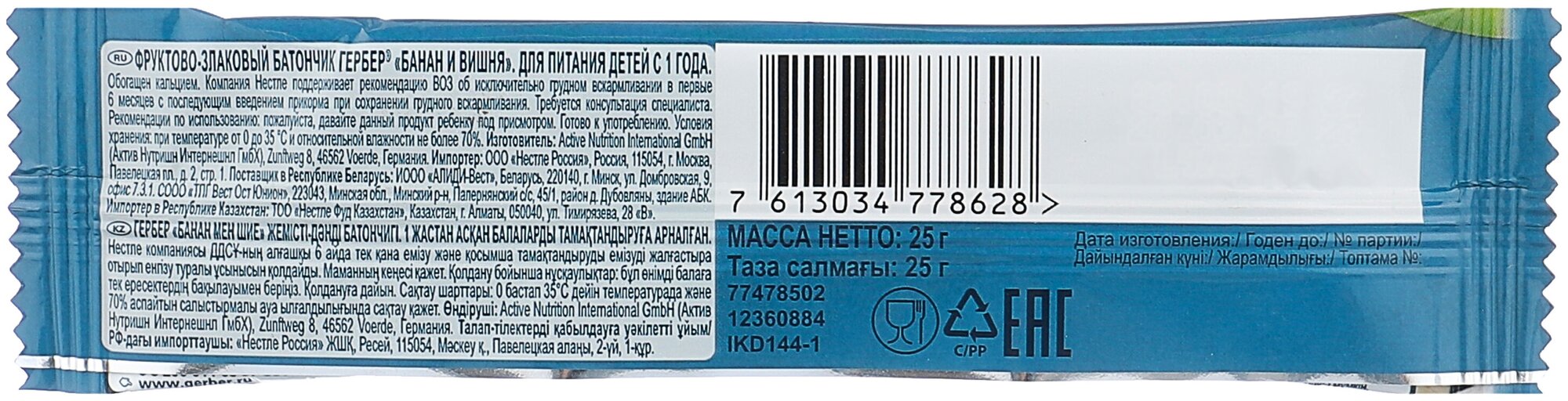 Фруктово-злаковый батончик с вишней и бананом, GERBER, с 12 мес, 25г информация: