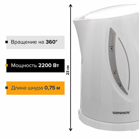Чайник SONNEN KT-1758, 1,7 л, 2200 Вт, закрытый нагревательный элемент, пластик, белый, 453415