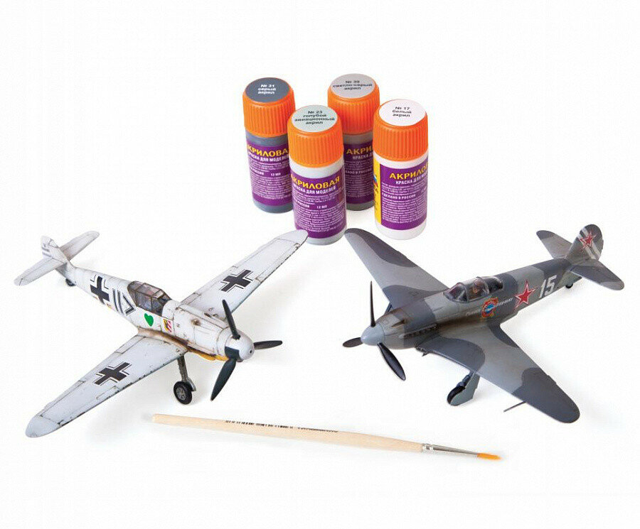 | Комплектация | сборная модель истребителя Мессершмитт BF - 109 / состоящая из 42 деталей в масштабе 1/72; сборная модель истребителя Як - 3 / состоящая из 46 деталей в масштабе 1/72; кисточка и краски (4 цвета); инструкция по сборке; красочная брошюра с интересными фактами об истории создания и боевом применении данных истребителей |