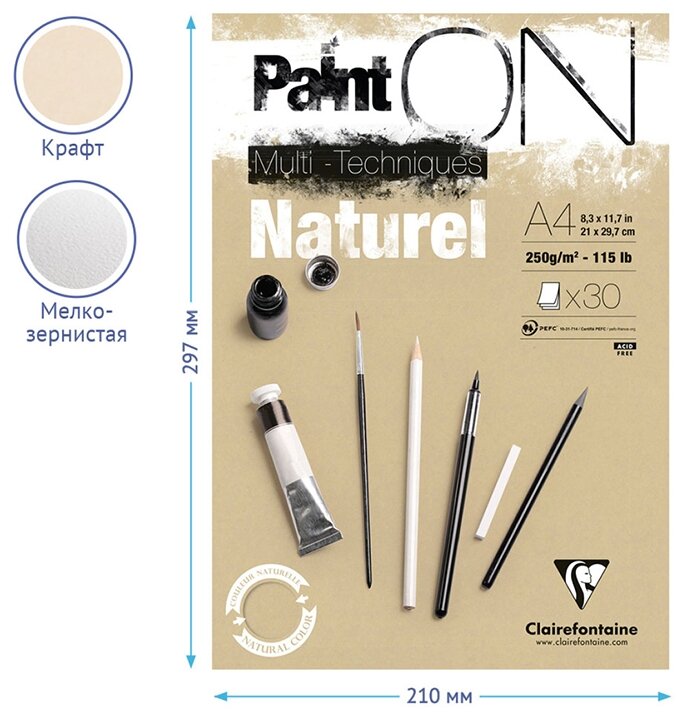 Clairefontaine Альбом для смешанных техник 30л., А4, на склейке Clairefontaine "Paint'ON Naturel", 250г/м2, крафт