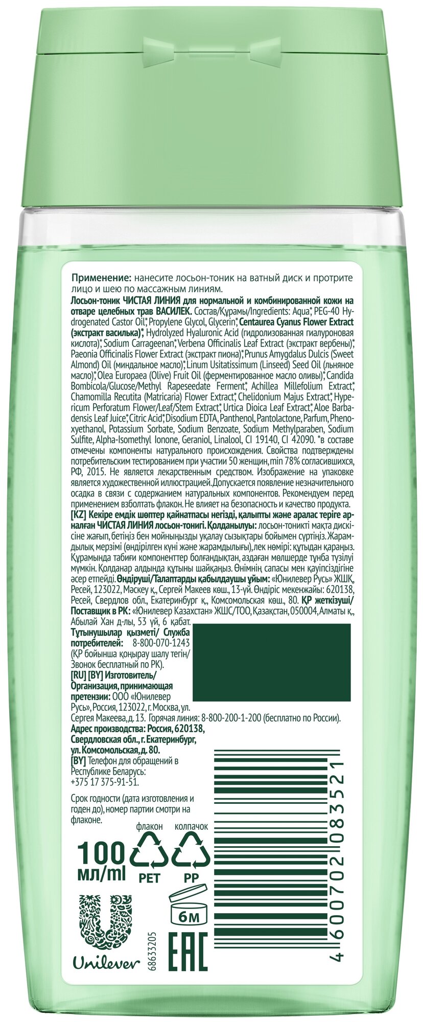 Чистая Линия лосьон-тоник увлажнение и свежесть для нормальной кожи с гиалуроном и экстрактом василька 100 мл