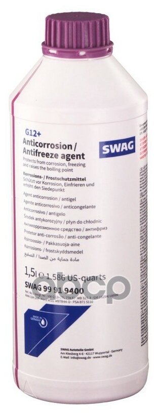SWAG 99919400 Антифриз (концентрат) 1,5 л, фиолетовый, G12+, Ford WSS-M97B44-D, MAN 324 SNF, MB 325.3, VW TL 774-D, VW TL 774-F, TOYOTA Super Long Life Coolant, Volvo VCS 1шт 2 110 ₽