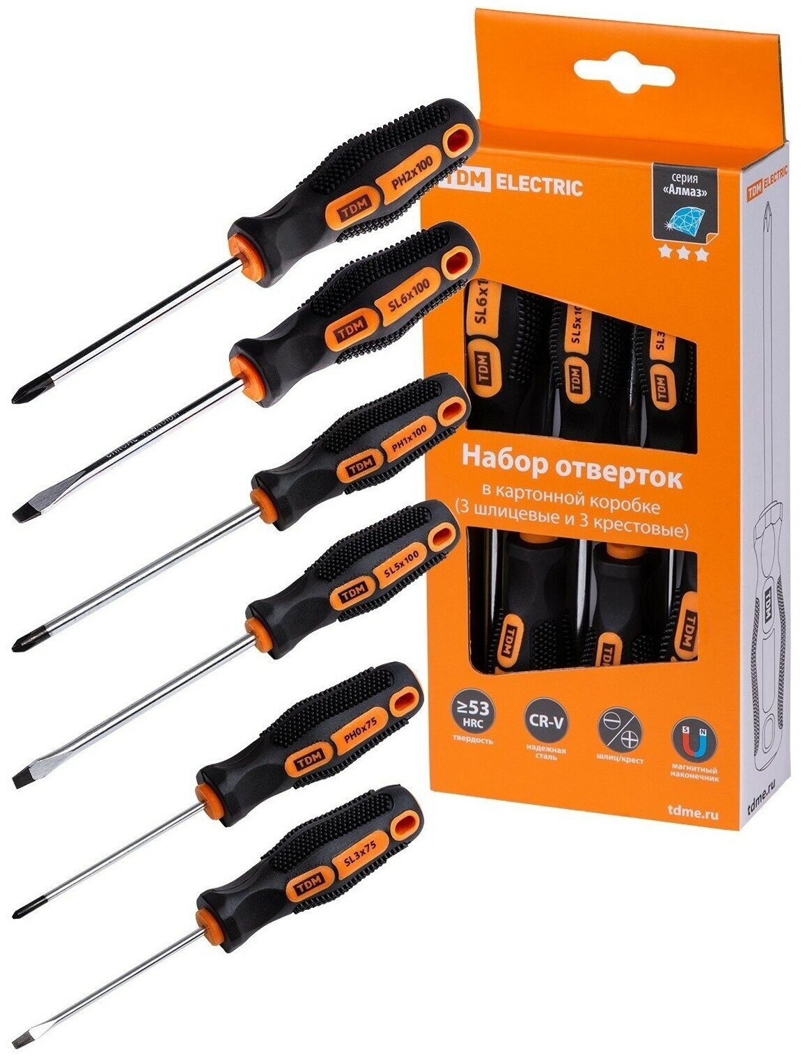 Набор отверток 6 шт.: SL:3х75;5х100;6х100, PH:0х75;1х100;2х100 (карт. коробка), CR-V "Алмаз" TDM