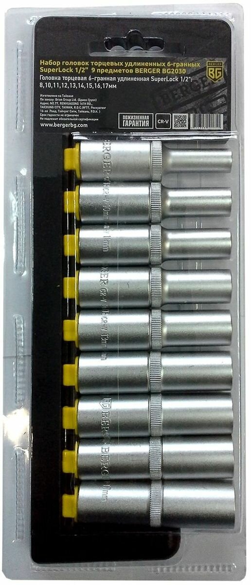 Набор головок торцевых удлиненных Berger BG 2030 1/2" SuperLock, 8-17мм, 9 предметов