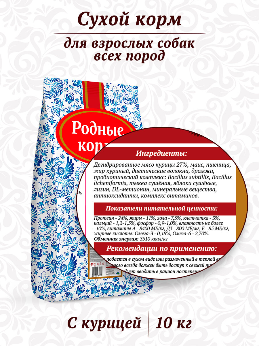 Родные Корма корм для взрослых собак всех пород, курица 10 кг