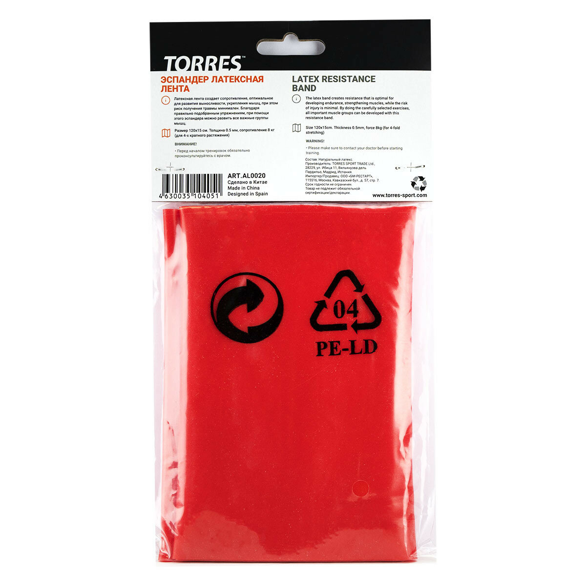 Эспандер "TORRES латексная лента" арт. AL0020,длина 120 см, шир.15 см, сопротивление 8 кг., красный