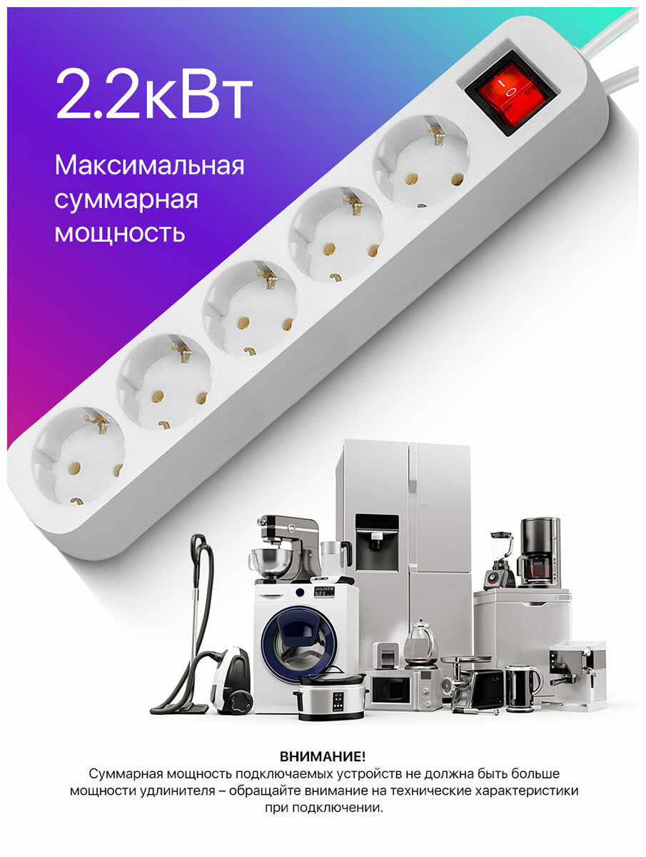 Удлинитель DEFENDER S518, 5 розеток, ПВС 3*1,0 мм2, мощность 2200 Вт, ток 10А, белый, с/з, выключатель, 1,8 м