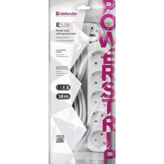 Отзывы на Удлинитель сетевой с заземлением DEFENDER E518 1.8 м, 5 розеток (пакет) (99229 )