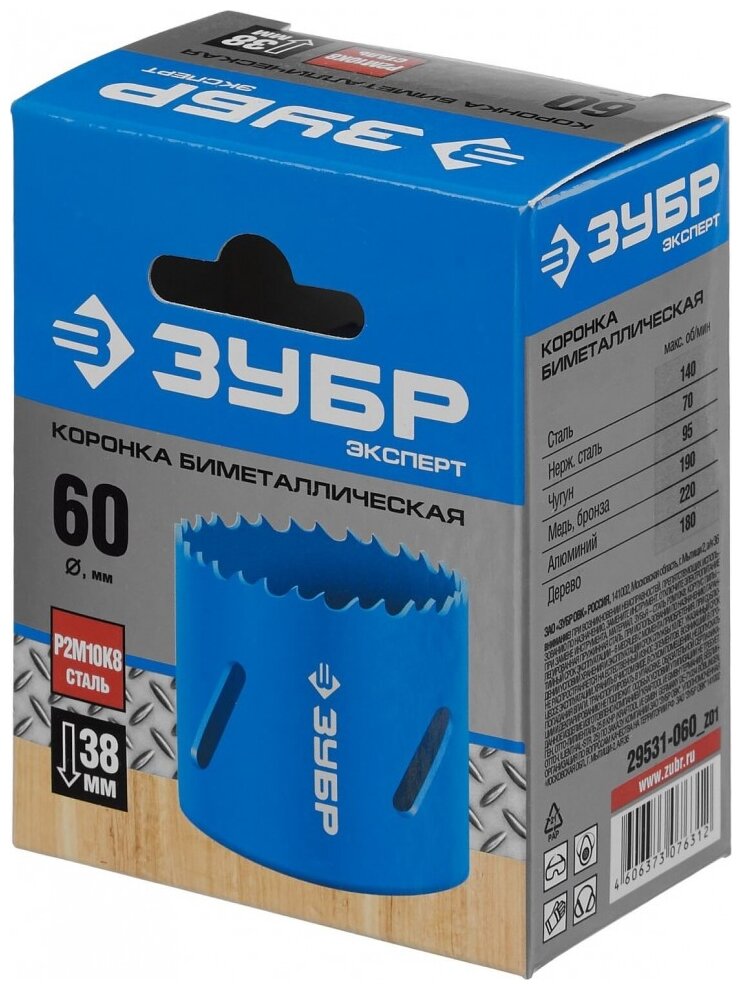 ЗУБР d 60 мм, глубина сверления до 38 мм, коронка биметаллическая 29531-060_z01