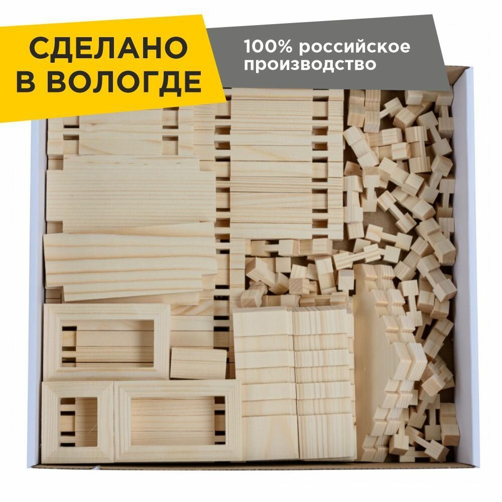 | Комплектация | бруски 3 см — 54 шт., бруски 9 см — 4 шт., бруски 13 см — 32 шт., бруски 19 см — 19 шт., большой фронтон крыши — 2 шт., скат крыши — 12 шт., полы (разные) — 3 шт., труба — 1 шт., большое окно — 2 шт., маленькое окно — 1 шт., подробная инструкция |