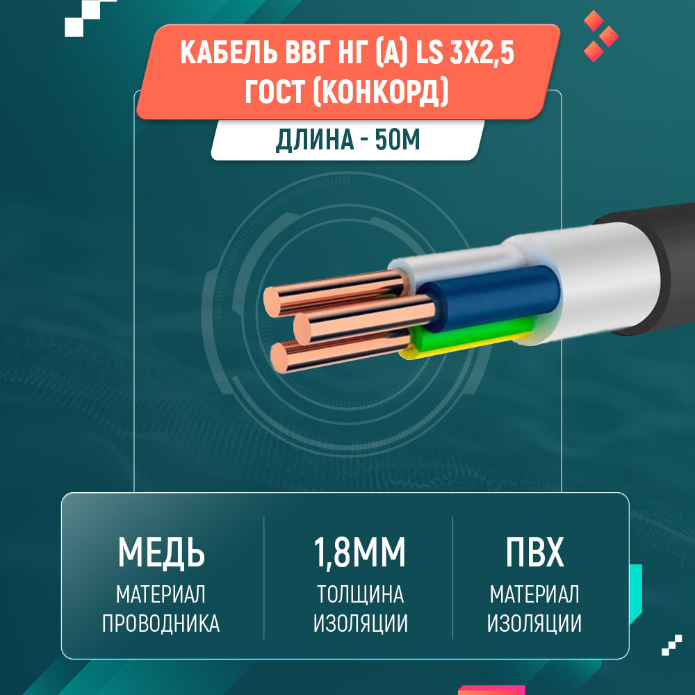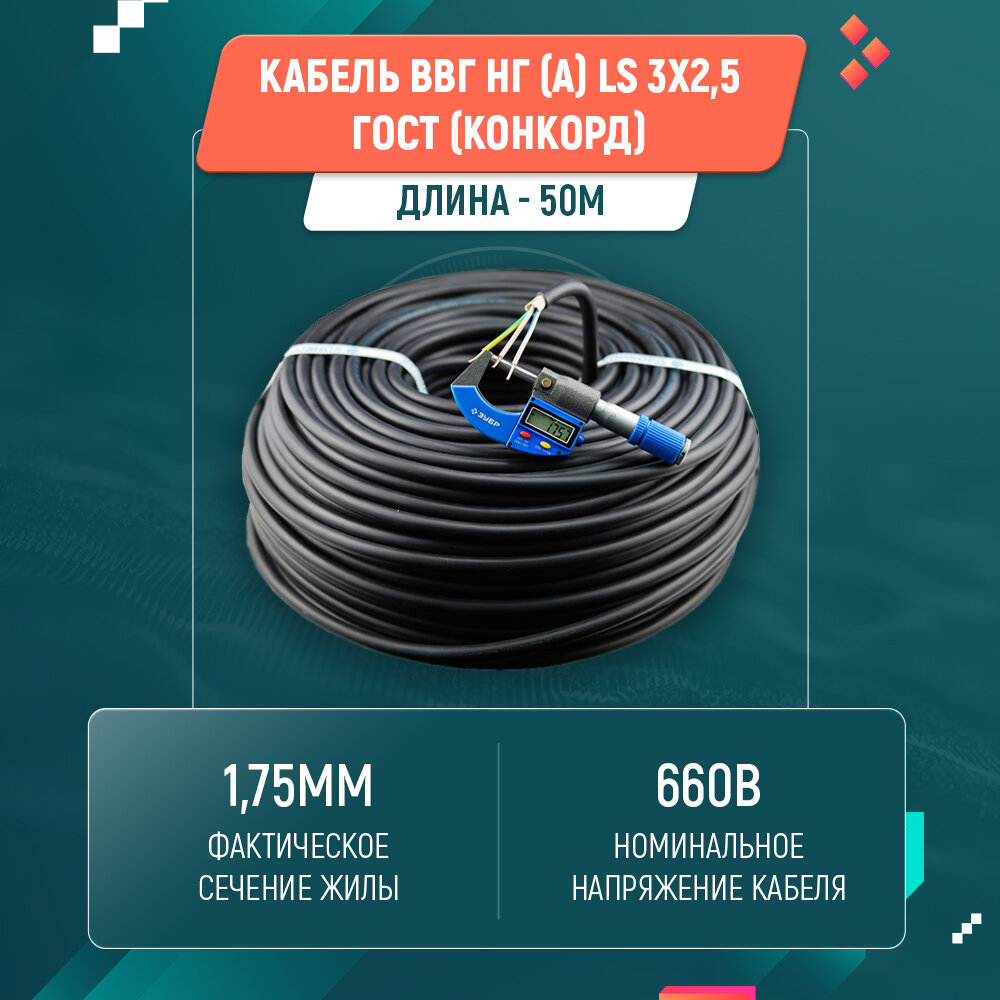 Кабель силовой ВВГнг(А)-LS 3х2.5 кв. мм Конкорд ГОСТ черный 50 м информация: