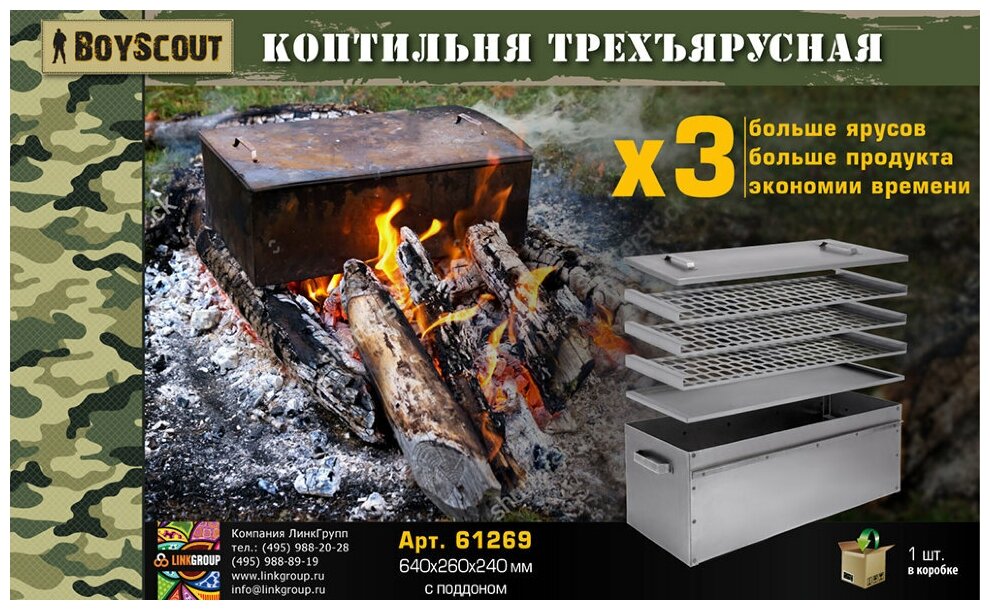 Коптильня BOYSCOUT 3-х ярусная, с поддоном, 640х260х240 мм /1 информация: