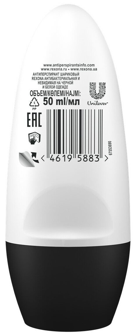 REXONA Антиперспирант шариковый Антибактериальная и Невидимая на черном и белом 50 мл
