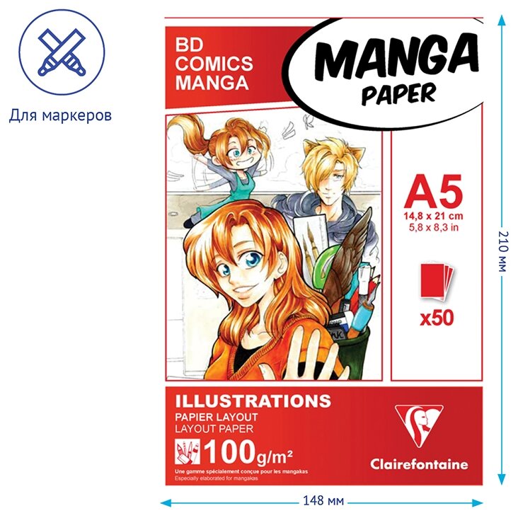 Скетчбук для маркеров Clairefontaine 50 л, А5, на склейке, "Manga Illustrations", 100г/м2 (94041C) информация: