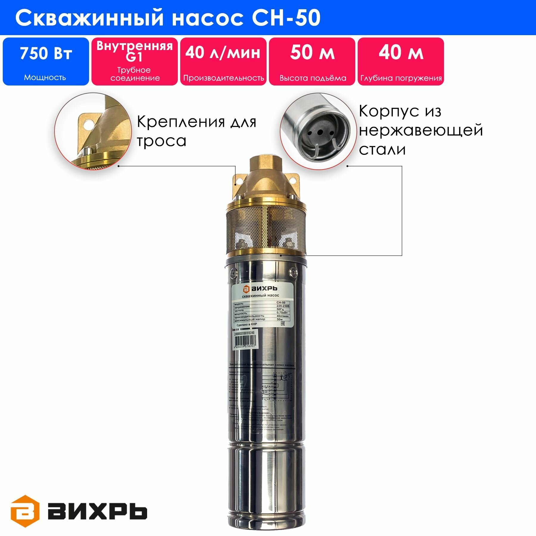 Скважинный насос вихрь СН-50, 750 Вт, высота подъема – 50 м, 40 л/мин, 1” 11 697 ₽