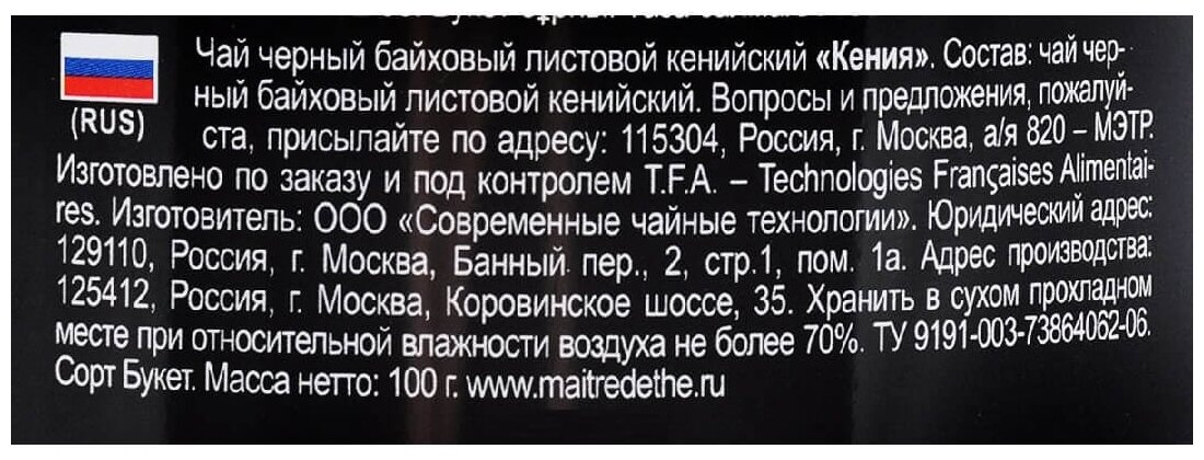 Чай черный MAITRE de Thé кения байховый кенийский среднелистовой 100 г информация:
