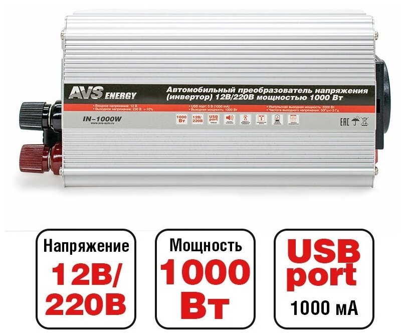 Инвертор автомобильный 12/220V AVS IN-1000W информация: