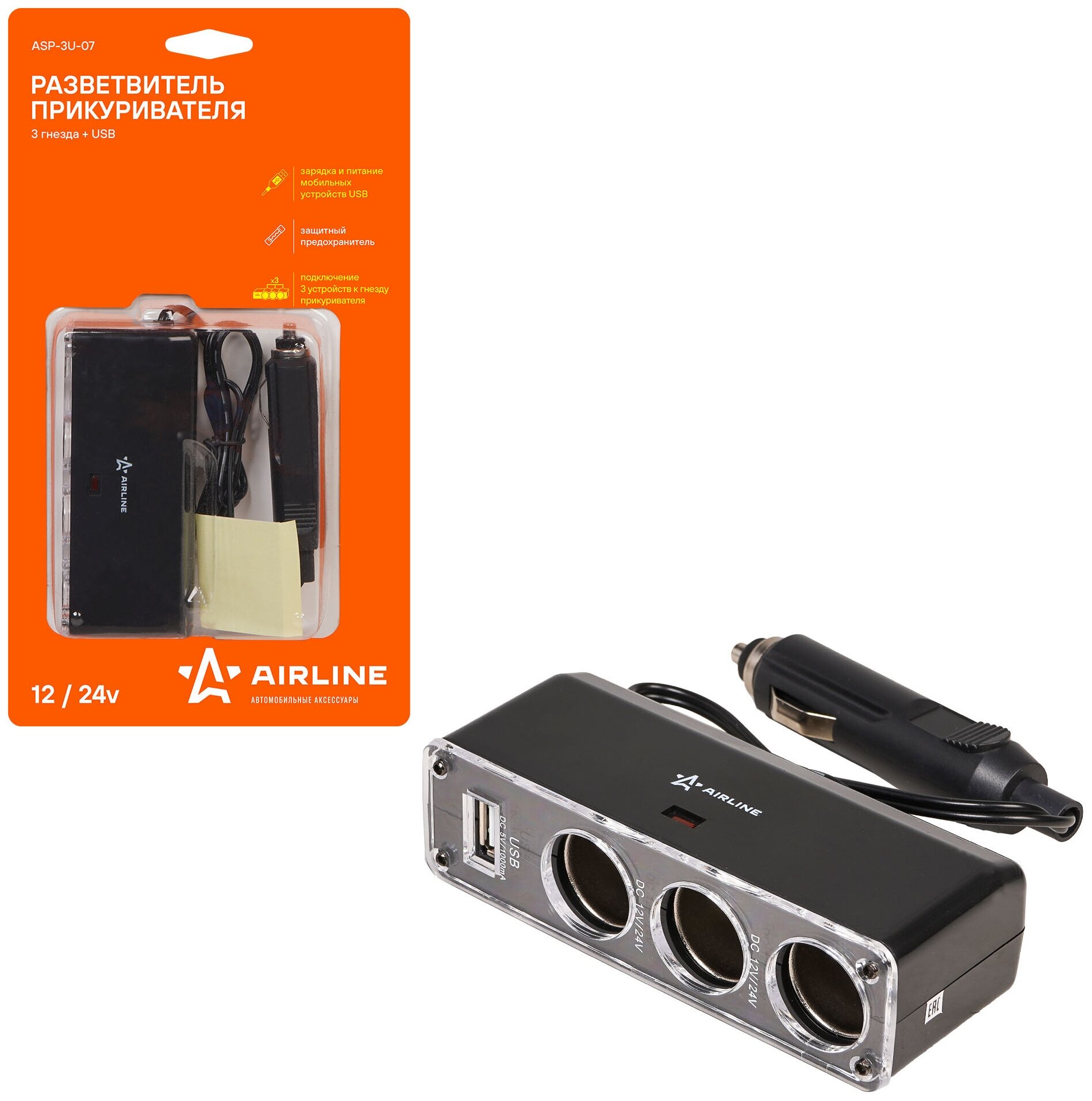 AIRLINE ASP-3U-07 Прикуриватель-разветвитель на 3 гнезда + USB (черный)