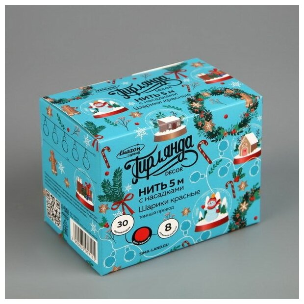 Гирлянда "Нить" 5 м с насадками "Шарики красные", IP20, тёмная нить, 30 LED, свечение красное, 8 режимов, 220 В