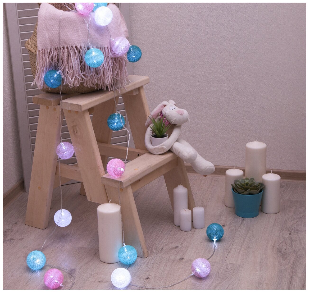 Гирлянда Нить 5 м с насадками Клубки серо-розовые, IP20, прозрачная нить, 20 LED, свечение белое, 220 В