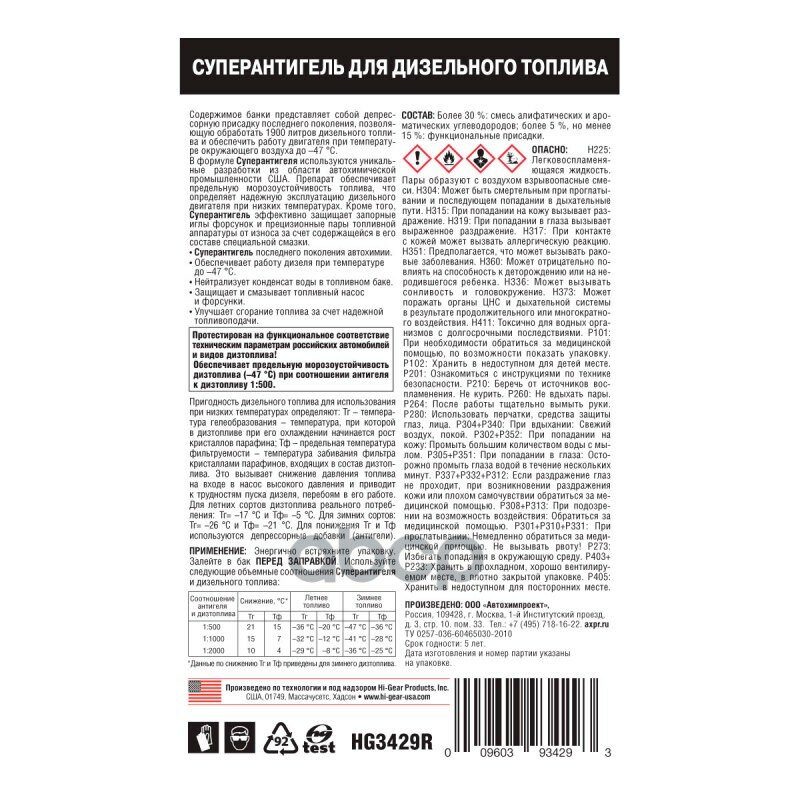 Суперантигель для дизельного топлива Hi-Gear HG3426R 295 мл топливная присадка депрессорная присадка Сделано в России 526 ₽