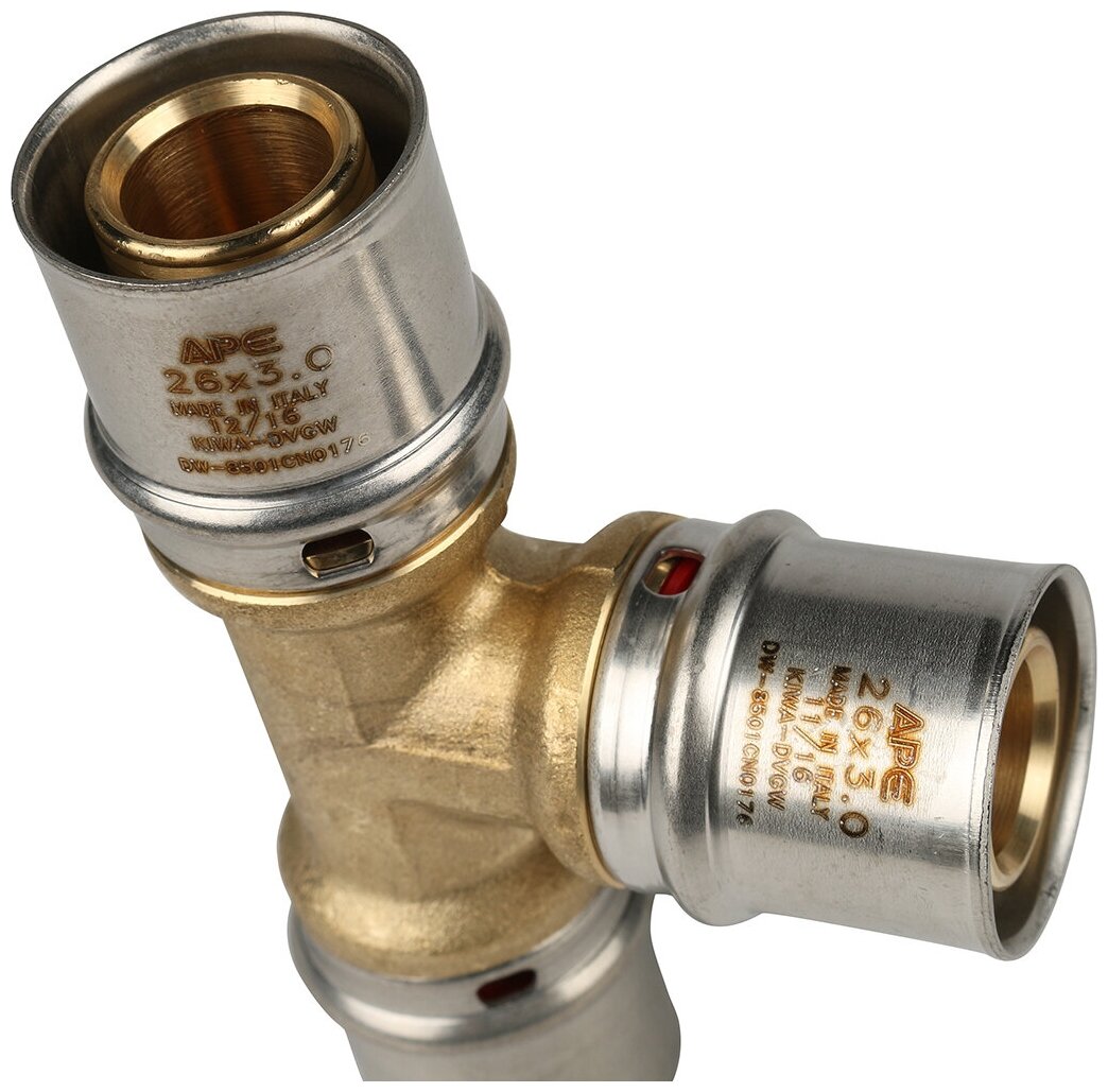 Тройник равнопроходный 26х26х26 для металлопластиковых труб прессовой ФУМ лента 10м