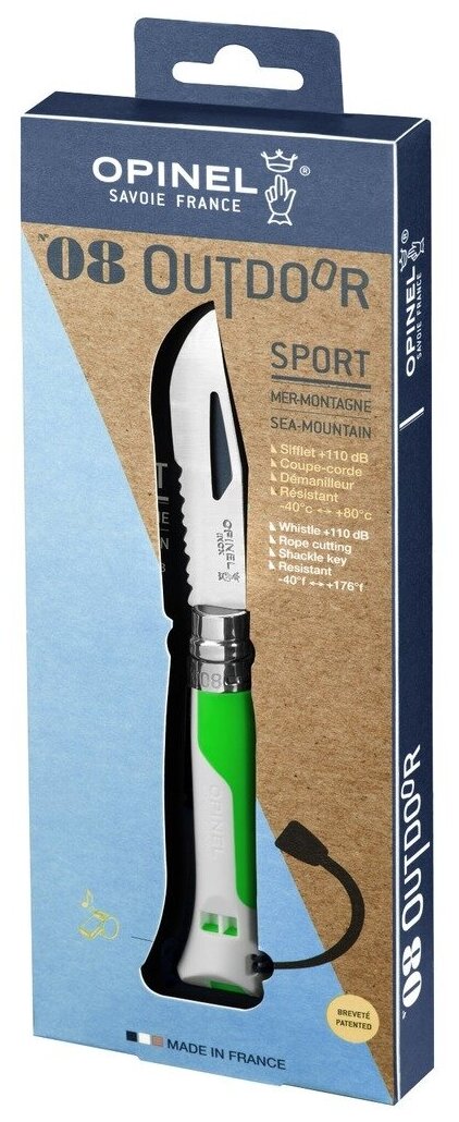 Нож Opinel серии Specialists Outdoor №08, клинок 8,5см, нерж.сталь, пластик, свисток, темляк, белый/зелёный информация:
