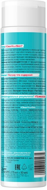 Тоник для лица Eveline Cosmetics, CLEAN YOUR SKIN, от прыщей, очищающе-матирующий, 225 мл 612 ₽