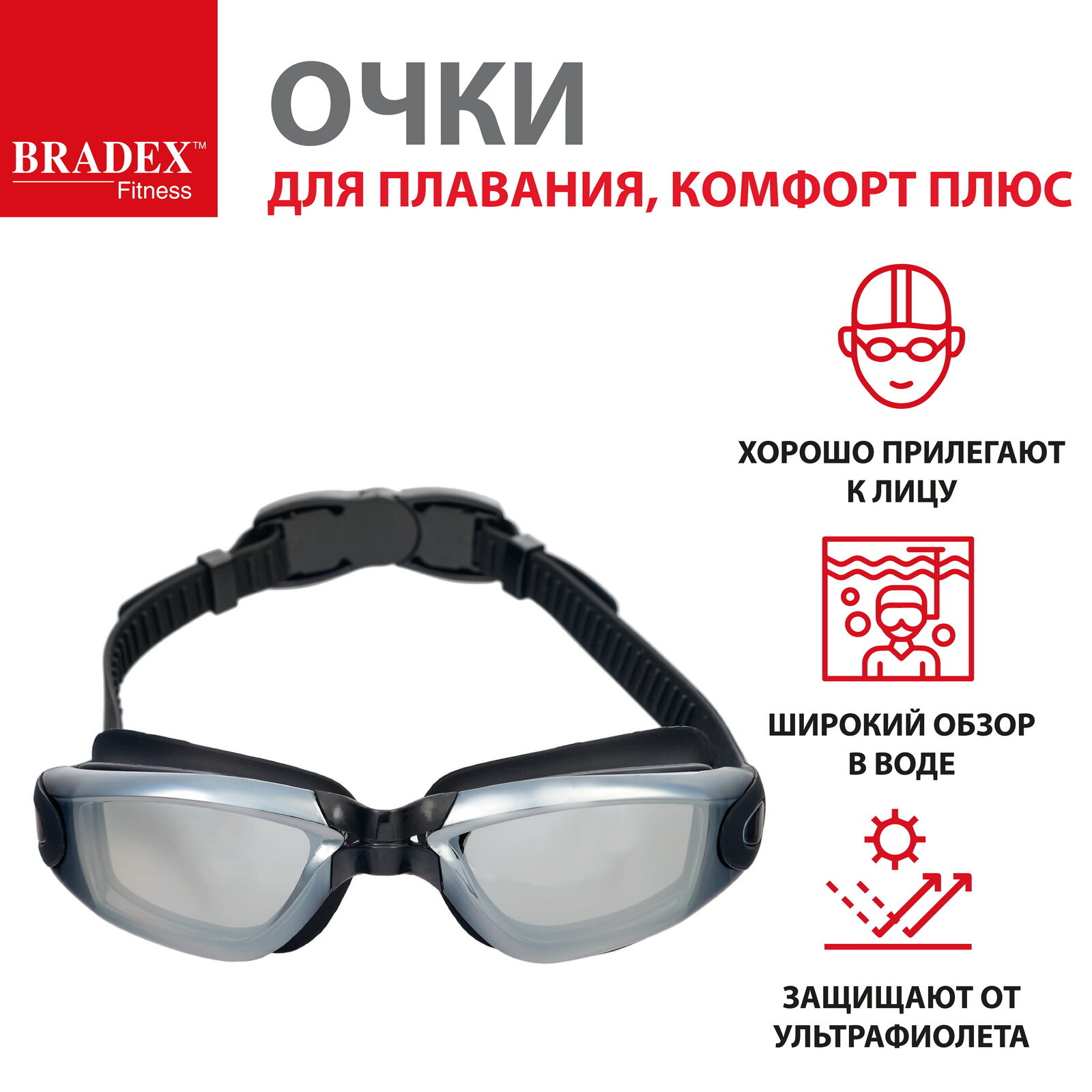 Отзывы на Очки для плавания Bradex , серия "Комфорт+", черные, цвет линзы - зеркальный