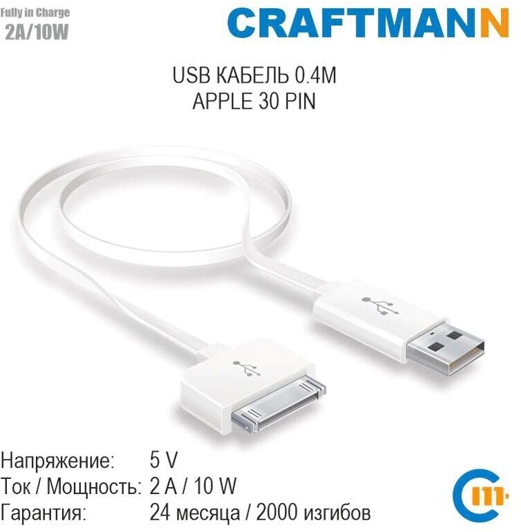 Кабель USB - Apple 30-pin Craftmann, белый, 0.4 м. для iPhone 2G, iPhone 3G, iPhone 3Gs, iPhone 4, iPhone 4S информация: