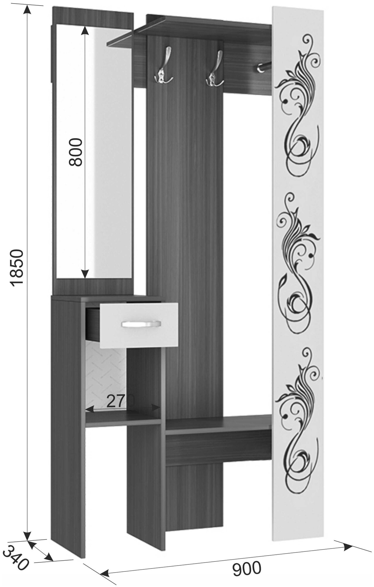Прихожая комплект САША-6 (правая) от Фант-Мебель, с зеркалом, с обувницей, шкафом и ящиками, 156x203,6x43 см. Ясень темный/Ясень светлый
