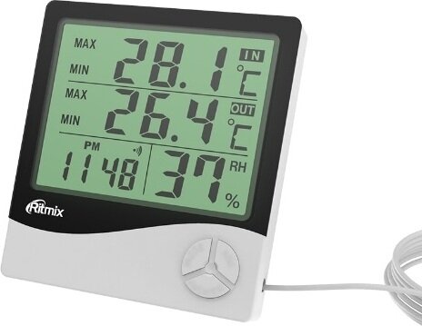 Метеостанция RITMIX CAT-230 черный/белый, дисплей LCD, термометр комнатный и уличный, диапазон показателей температуры -50°C ..+70°C (-58°F..+158°F), гигрометр комнатный, диапазон показателей влажности 10% ..99%, электронные часы, будильник, календарь, пи