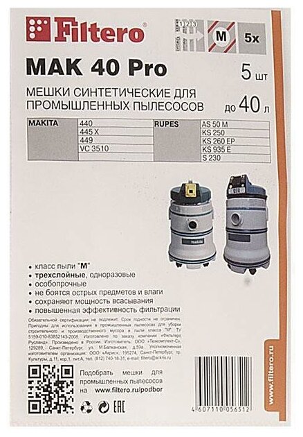 Аксессуары для пылесосов Мешки пылесборные Filtero MAK 40 Pro 5шт . информация: