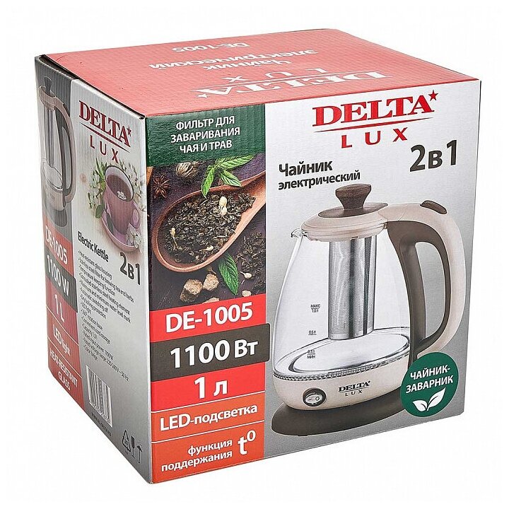 Чайник электрический 1100 Вт, 1 л DELTA LUX DE-1005 бежевый, фильтр для чая, функция поддержания температуры