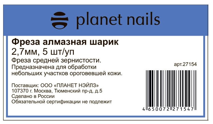Planet Nails Фреза алмазная шарик 2,7 мм, 5 шт./уп. информация: