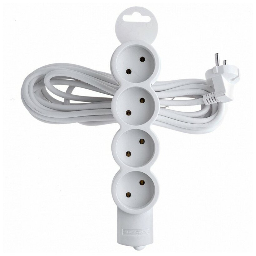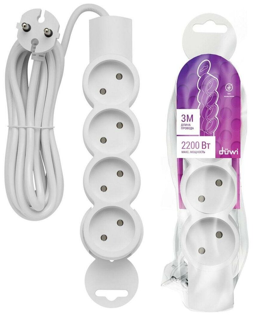 32010 6 Удлинитель бытовой, 4 гнезда, 3м, без заземления, с держателем, 2200Вт, 10А, белый, 32010 6, duwi, цена за 1 шт.