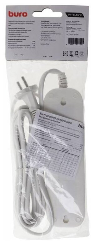 Удлинитель Buro BU-PSL4.5/W, 4 розетки, 5 м, б/з, 7А / 1500 Вт белый информация: