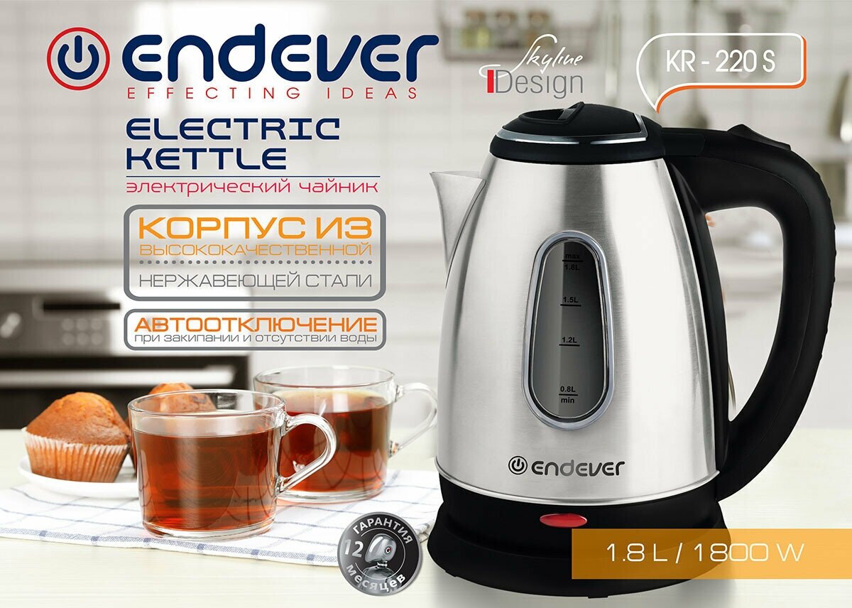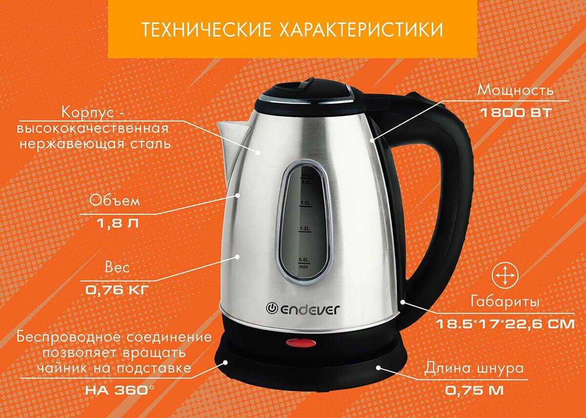 Чайник электрический стальной Endever KR-220S / 1,8л / 1800 Вт информация: