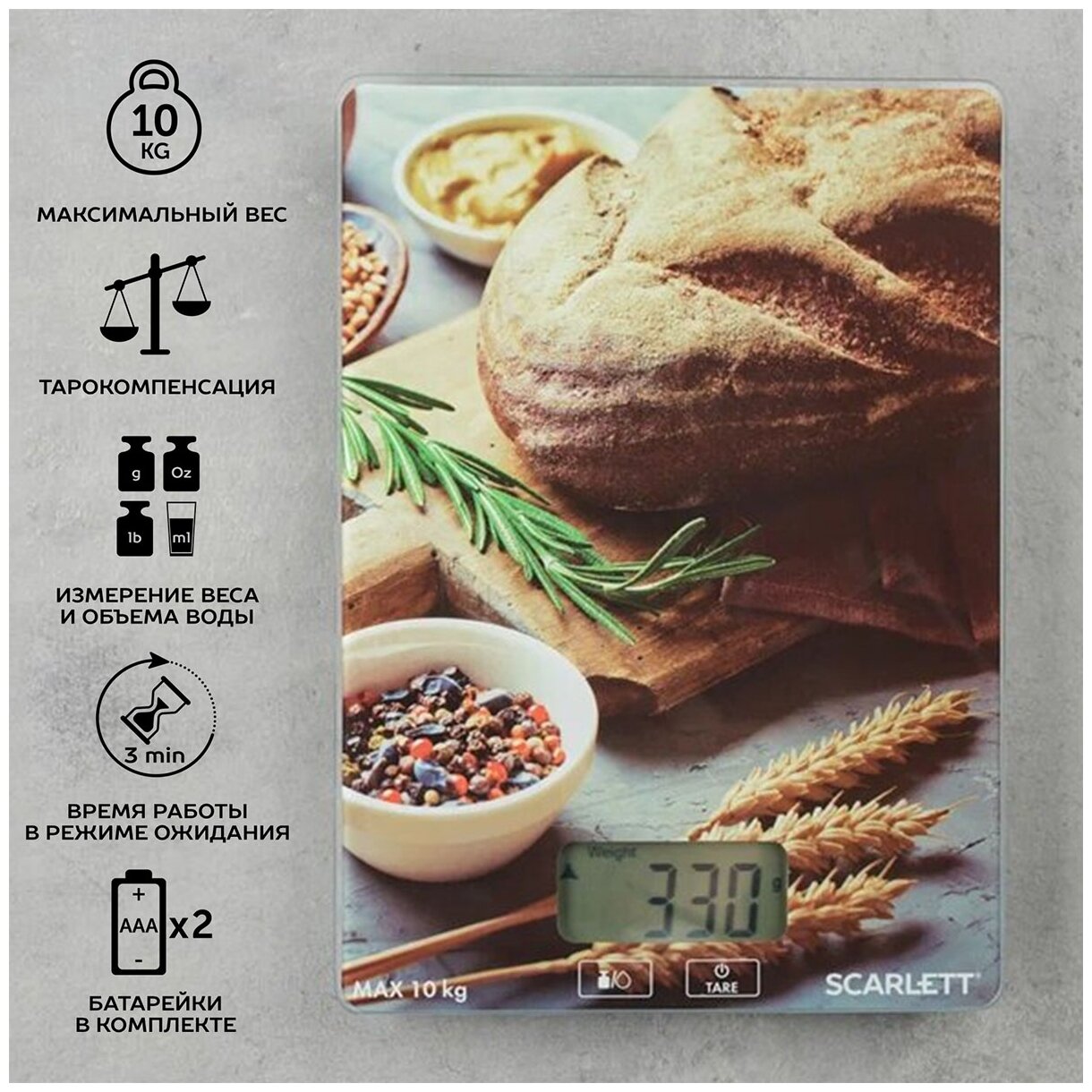 Весы кухонные SCARLETT SC-KS57P65 "Хлеб", электронный дисплей, max вес 10 кг, тарокомпенсация, стекло информация:
